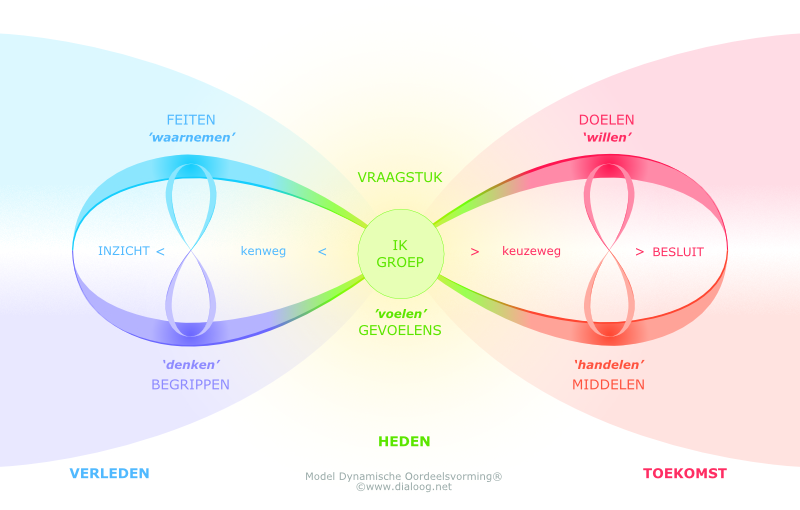 - VRAAG/PROBLEEM (voelen): een oordeelsvormingsproces start altijd in het heden met een vraag of probleem van een individu of een groep. Een vraag of een probleem wortelt in het gevoelsleven van mensen, in het voelen. Onder een vraag ligt een gevoeld ’te kort’ aan weten en de behoefte daarin te voorzien. Achter een probleem ligt een gevoeld ’te kort’ aan adequate actie en de behoefte daarin te voorzien.
